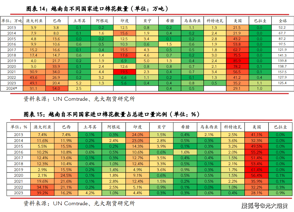 ,2023 年约 5 成,进口巴西棉占比逐步下降,由两成降至一成,其余进口相对分离,阿富汗、西非、均有涉及。土耳其:土耳其棉花进口次要来历于巴西和美国,巴西棉进口占比逐步添加,2024年约占 3 成,进口美棉比例由接近 4 成降至 2 成摆布。巴西:巴西曾经超越美国成为全球第一大棉花出口国,约三分之一出口至中国,五分之一出口至越南,出口至孟加拉、巴基斯坦、土耳其数量占比均正在 10%上下。美国:2024/25 年度美国棉花出口至中国数量锐减,由客岁的 4 成降至不脚 1 成,出口至巴基斯坦、越南各占两成,约 1 成半出口至土耳其。:中国和越南是棉花最次要的出口国,2024 年棉花出口中国占比约 28%,出口越南数量占比约 26%。近年来国际商业形势日趋复杂,国商业流向变化多样,特朗普上台以来,其关税政策进一步加剧全球大商品商业款式变化。基于此,我们决定对全球棉纺财产链进出口款式进行细致梳理,以系列形势呈现,本篇为起首引见近10 年来全球棉花进出口款式变化,以供参考。